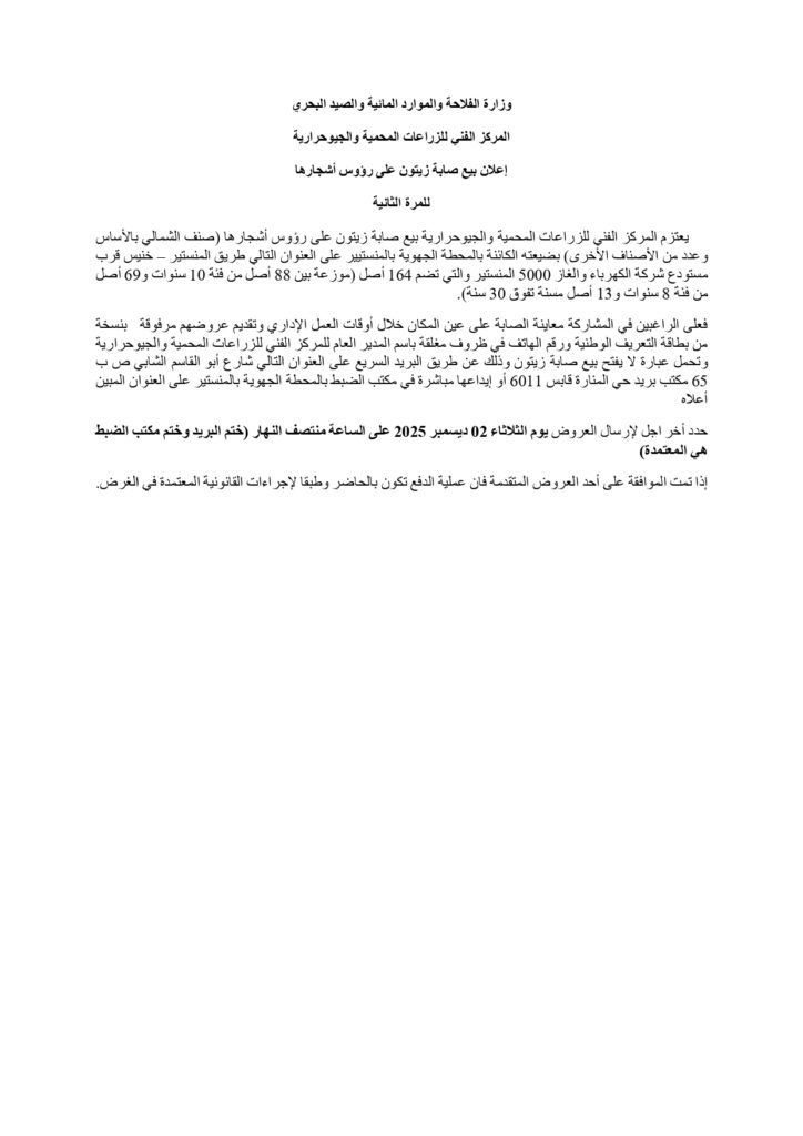 إعلان بيع صابة زيتون على رؤوس أشجارها للمرة الثانية