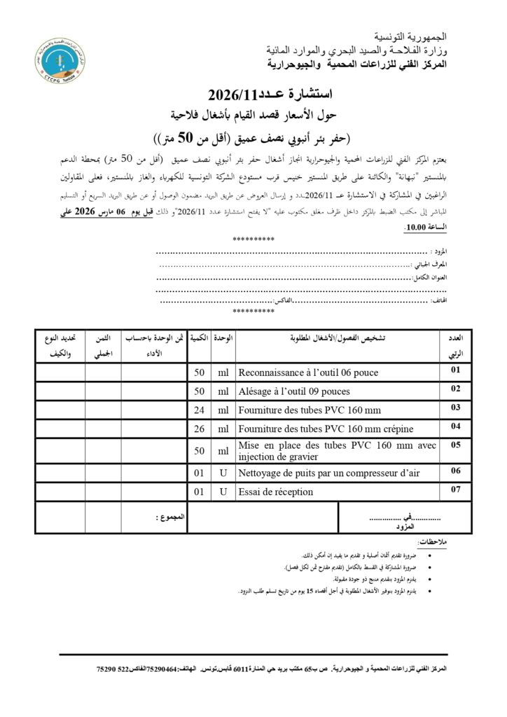 إعلان استشارة عدد 11/2026 حول الأسعار قصد القيام بأشغال فلاحية (حفر بئر أنبوبي نصف عميق (أقل من 50 متر))